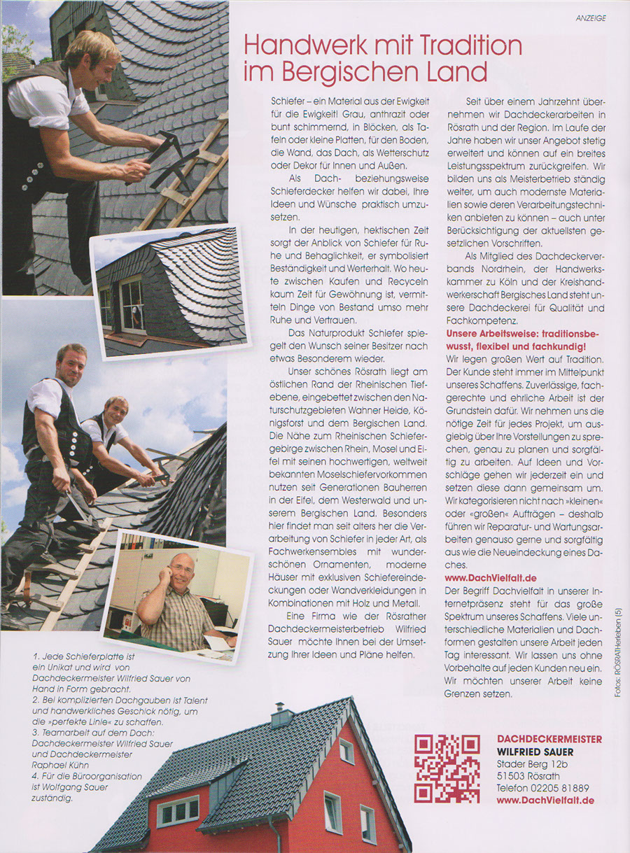 In diesem Artikel wird Ihnen das Unternehmen und die Person Dachdeckermeister Wilfried Sauer vorgestellt. Er beginnt mit den Worten: "Schiefer – ein Material aus der Ewigkeit für die Ewigkeit!"